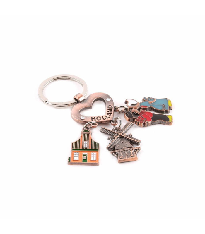 Sleutelhanger met Hollandse bedels, kussend paartje, molentje, Zaans huisje, hangend aan een hartje met het opschrift Holland.