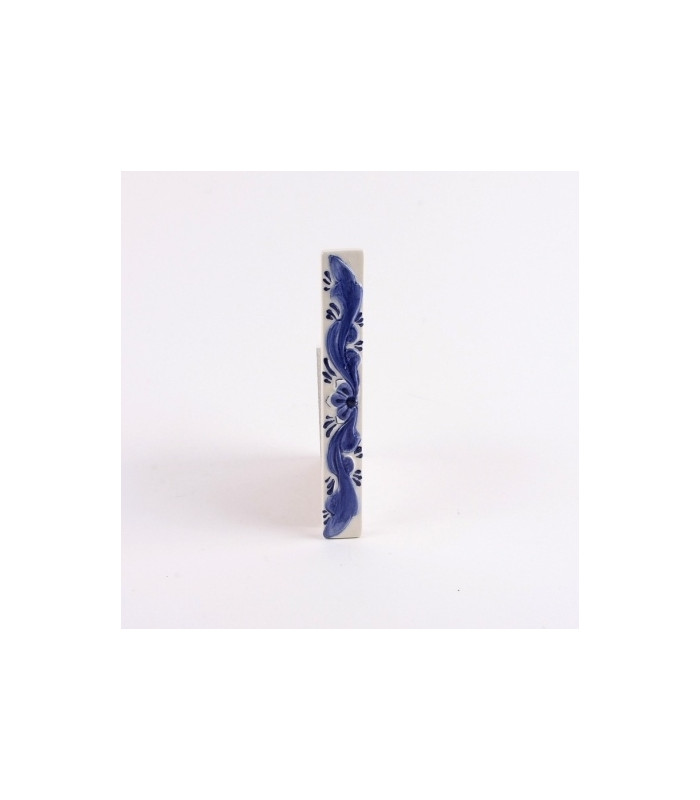 Huisnummer eind-beginstuk is gemaakt van keramiek. Het plaatje is 1,5 centimeter breed en 15 centimeter hoog. Het nummer heeft een Delfts blauwe versiering.