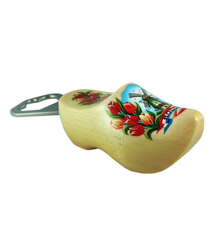 Dit blank gelakte flesopener klompje met molen en tulpen is een geweldig souvenir. Oer-Hollands én nuttig. Je gebruikt hem steeds weer om flesjes met een kroonkruk te openen. Het klompje is van hout en ligt lekker in de hand. De totale lengte van de flesopener is 13 centimeter.