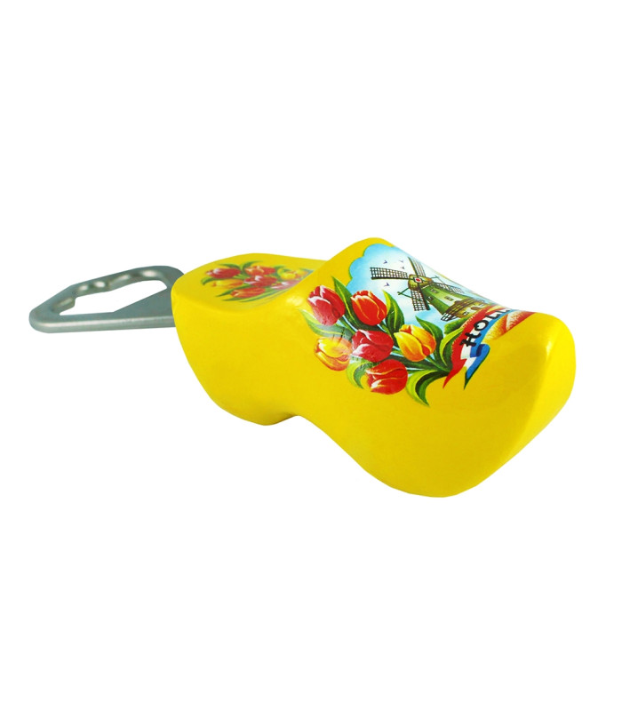 Dit gele flesopener klompje met molen en tulpen is een geweldig souvenir. Oer-Hollands én nuttig. Je gebruikt hem steeds weer om flesjes met een kroonkruk te openen. Het klompje is van hout en ligt lekker in de hand. De totale lengte van de flesopener is 13 centimeter.