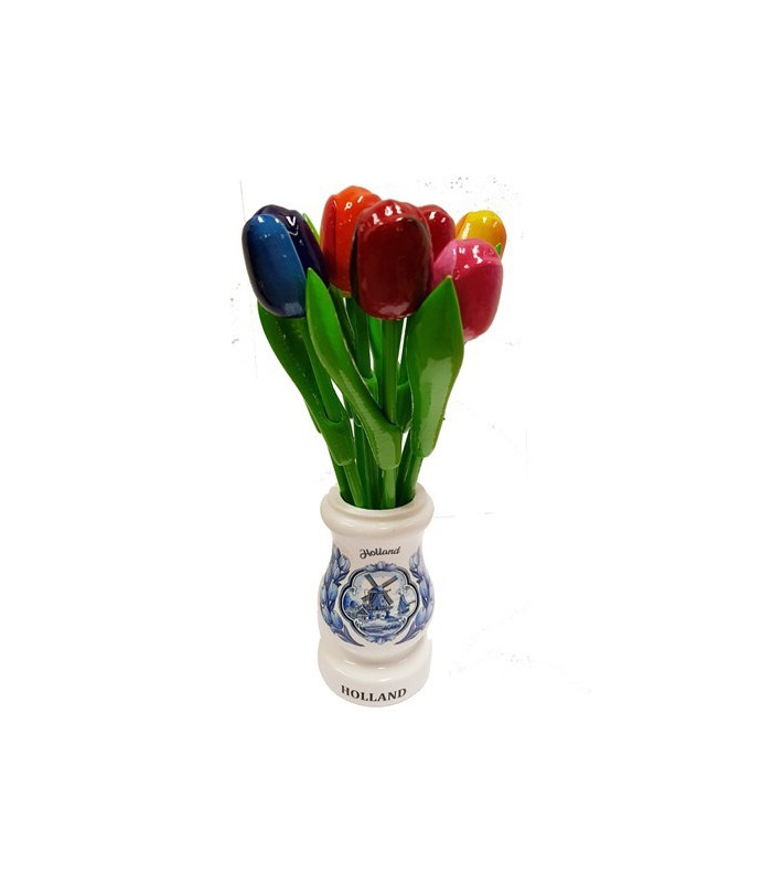 Houten tulpenboeket Delfts blauw vaasje - Typisch Hollands souvenir