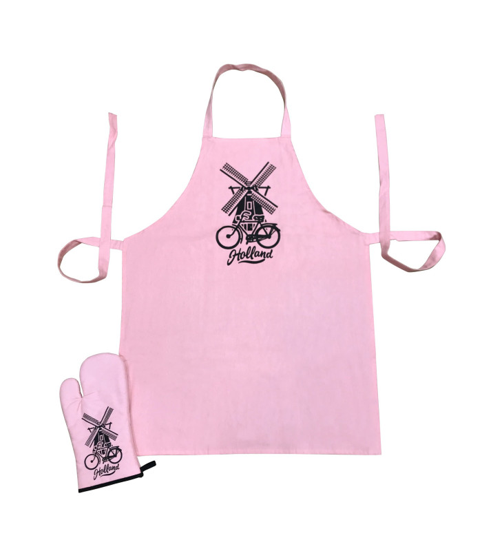 Deze tweedelige keukenset in ROSE bestaat uit een schort en ovenwant (kitchen apron, oven mitt). De print is echt Hollands. Met een molen, fiets en tulpen. Een souvenir dat je inspireert tot het bereiden van de lekkerste Hollandse stamppotten.