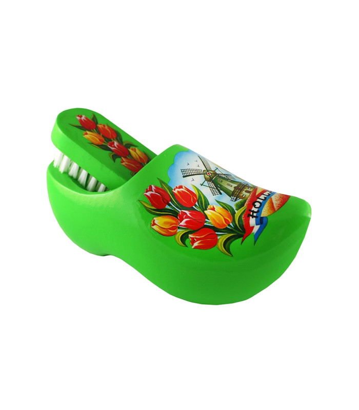 Breng een stukje Holland naar huis met dit leuke groene klompje! Het is niet alleen een leuk decoratief item, maar ook praktisch met de bijbehorende borstel. De levendige kleuren en typisch Nederlandse afbeelding maken het een geliefd souvenir.