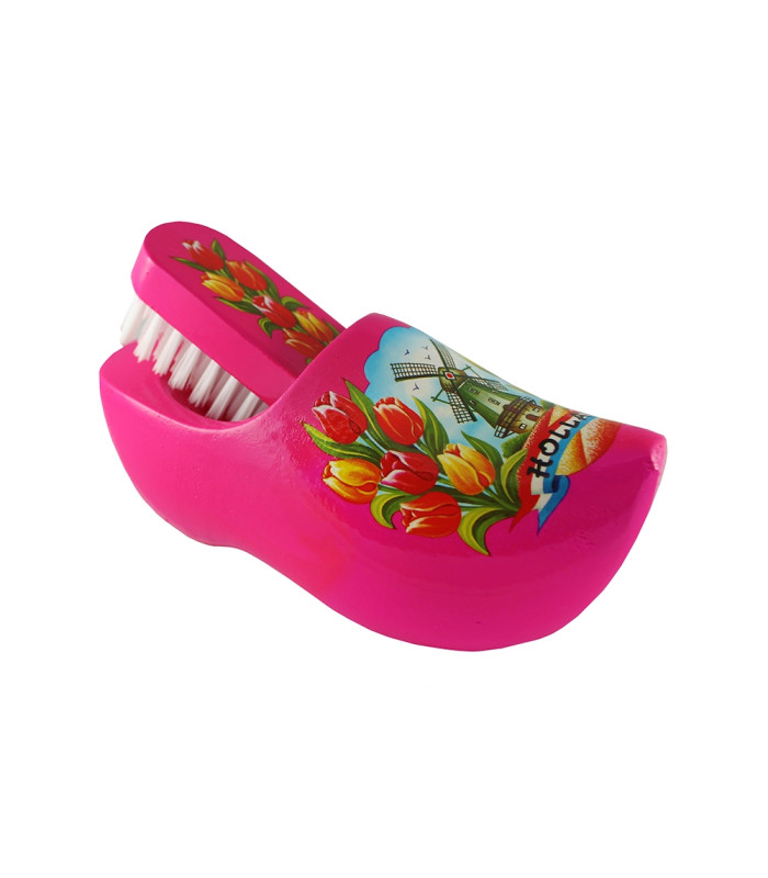 Breng een stukje Holland in huis met dit schattige roze klompje. Het is niet alleen een decoratief item, maar ook een praktisch borsteltje. De levendige afbeelding van tulpen en een molen maakt het een echt eyecatcher.