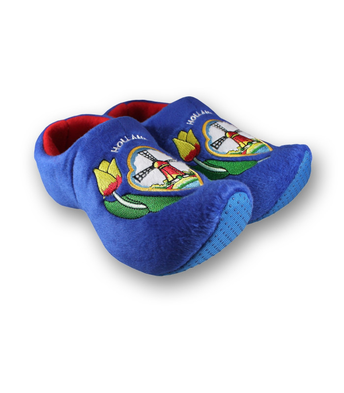 Blauwe klomppantoffel met geborduurde molen en tulpen