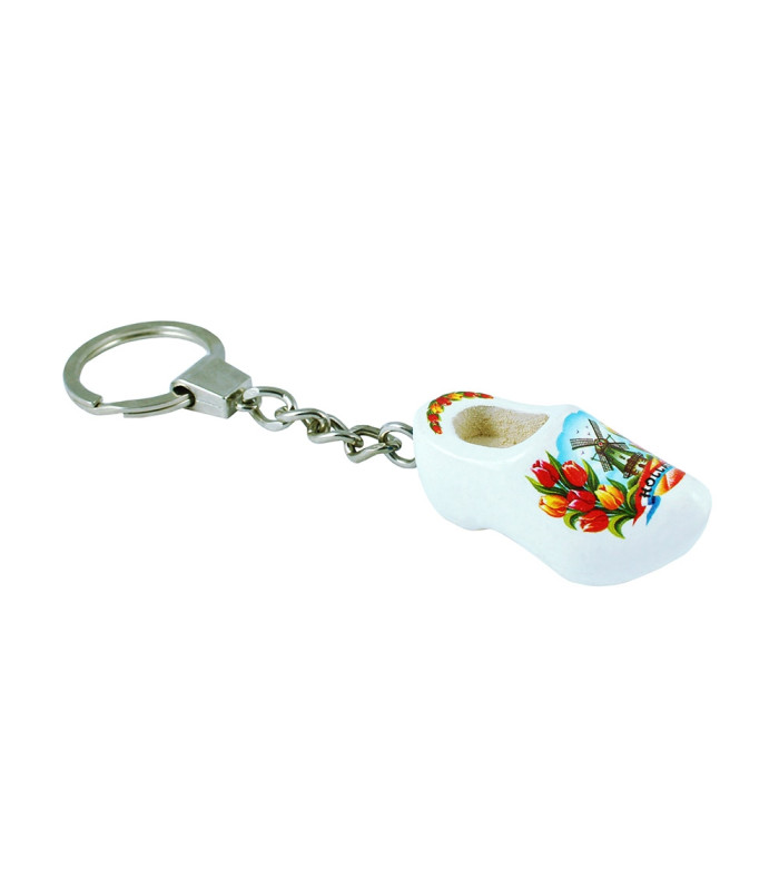 Deze sleutelhanger met 1 wit klompje is gemaakt in Nederland. Het houten klompje aan de sleutelhanger is vier centimeter groot. Hang deze sleutelhanger met 1 wit klompje aan je sleutelbos en denk steeds weer even terug aan Holland!
