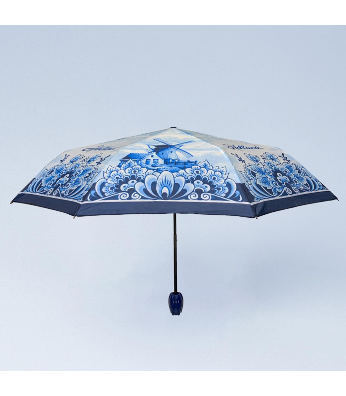 Deze compacte en praktische paraplu is uitgevoerd in het traditionele Delfts blauwe aardewerk patroon. Het opvallende ontwerp met een Nederlandse molen maakt deze paraplu een must-have voor liefhebbers van Hollandse kunst en cultuur. De paraplu is ideaal voor dagelijks gebruik en past gemakkelijk in je tas.