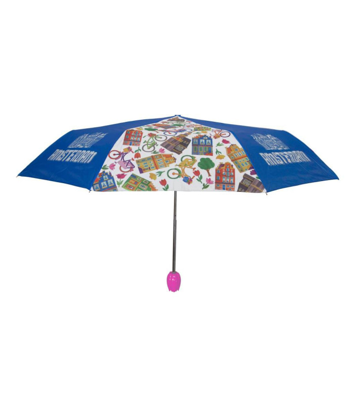 Bij een echte Hollandse lucht hoort op z’n tijd ook een flinke regenbui. Een leuk souvenir of cadeau! Vouwparaplu met Amsterdam compilatie.