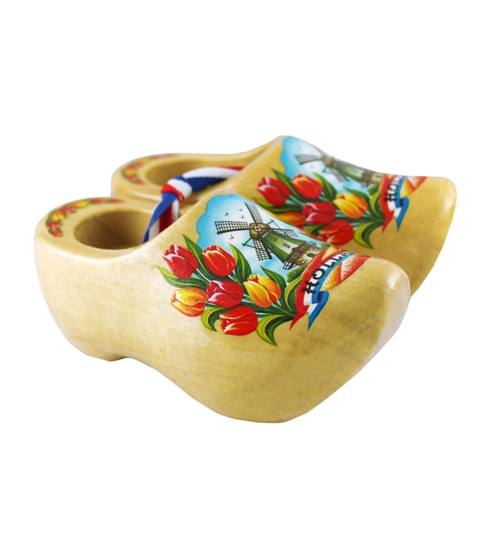 Deze houten souvenirklompjes zijn blank gelakt en in Holland gemaakt. De twee klompjes worden bijeengehouden met een rood-wit-blauw lintje. Ze zijn acht centimeter groot en je neemt ze dus gemakkelijk mee in je koffer.