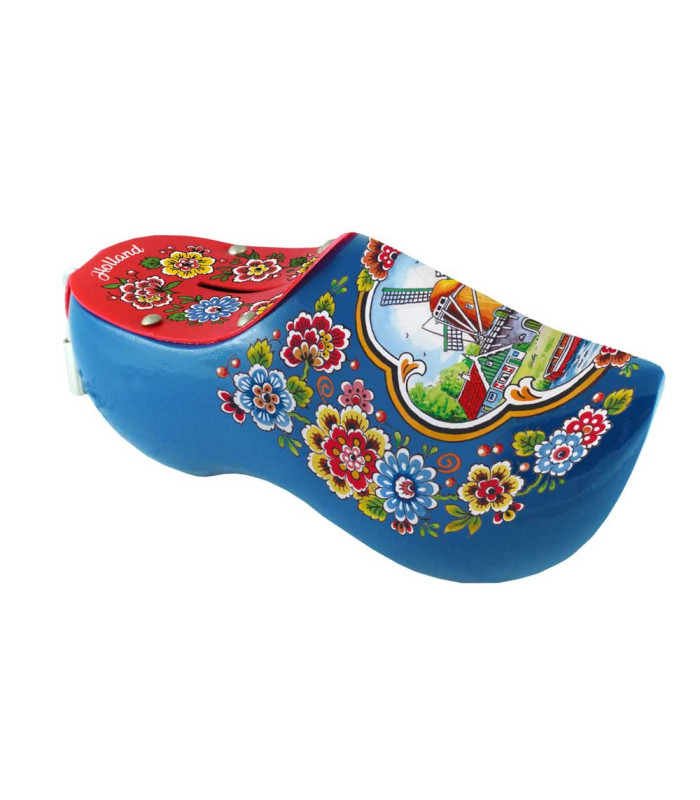 Dit spaarpotklompje Blauw met molen en tulpen is een origineel souvenir én cadeau. De houten spaarpot in de vorm van een klomp is veertien centimeter groot. De klomp heeft aan de achterkant een slotje. Met het bijgeleverde sleuteltje kun je deze openmaken