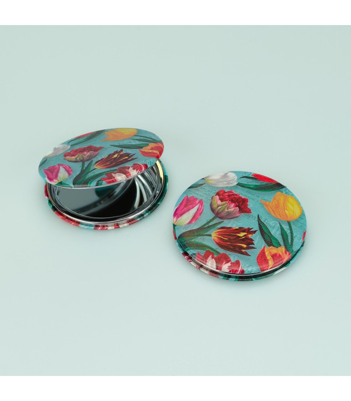 Dit compacte en stijlvolle spiegeldoosje is bedrukt met een betoverend patroon van kleurrijke tulpen op een frisse groene achtergrond. Perfect voor onderweg om je make-up bij te werken of gewoon als een leuk accessoire. Het is niet alleen functioneel, maar ook een echte eyecatcher!