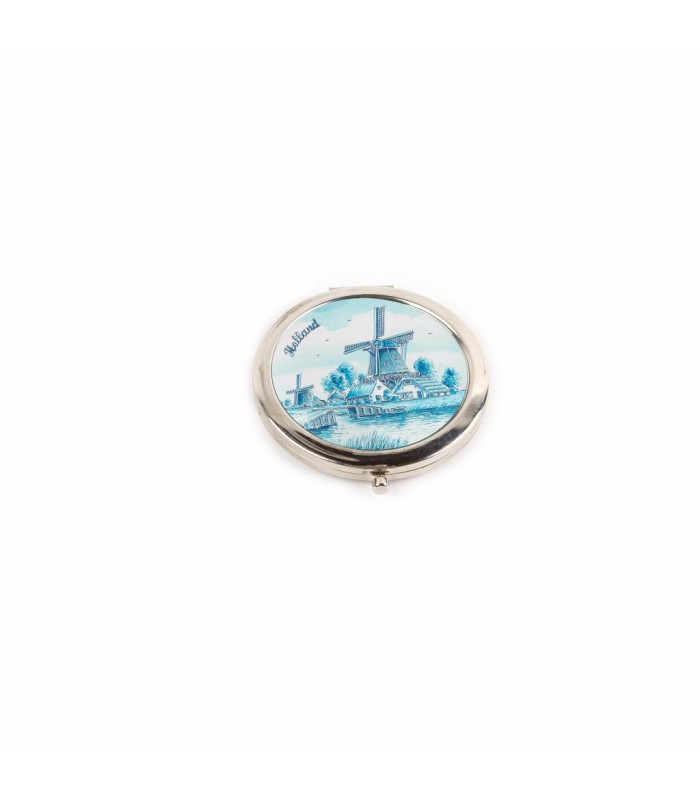 Dit ronde spiegeldoosje heeft een delftsblauwe reliëf opdruk van een Hollandse molen, Bij een typisch Hollands landschap, en de tekst ‘Holland’. Het spiegeltje is 7,5 centimeter groot en heeft een kliksluiting.