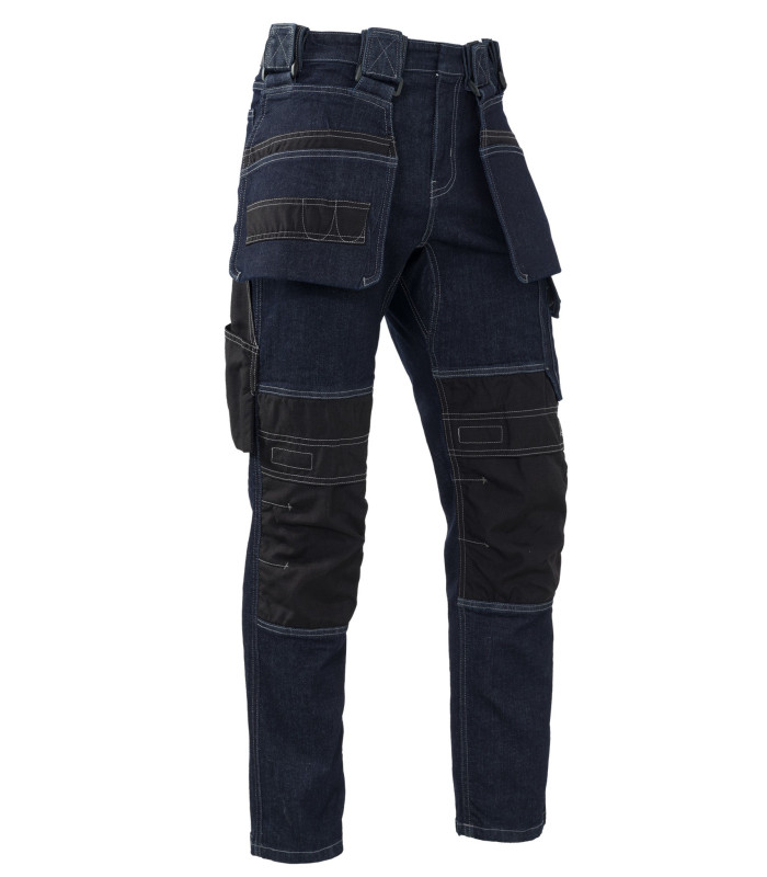 De broek beschikt over afneembare holsterzakken. De holsterzakken hebben een klittenbandsluiting en een Cordura afwerking. Daarnaast heeft de spijkerbroek een duimstokzak , kniestukken en comfortabele zijzakken van Cordura. De werkspijkerbroek is gemaakt van 90% katoen, 8% polyester en 2% stretch