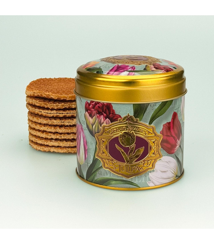 Dit charmante blik is een typisch Hollands souvenir en perfect voor liefhebbers van stroopwafels. Het blik is versierd met een prachtige afbeelding van gekleurde tulpen op een zachtgroene achtergrond, met goudkleurige randen en een reliëf van Hollandse tulpen. Het blik bevat 8 heerlijke stroopwafels met een romige botervulling. Het is een ideaal cadeau voor jezelf of voor iemand anders die van zoete lekkernijen en Nederlandse cultuur houdt.