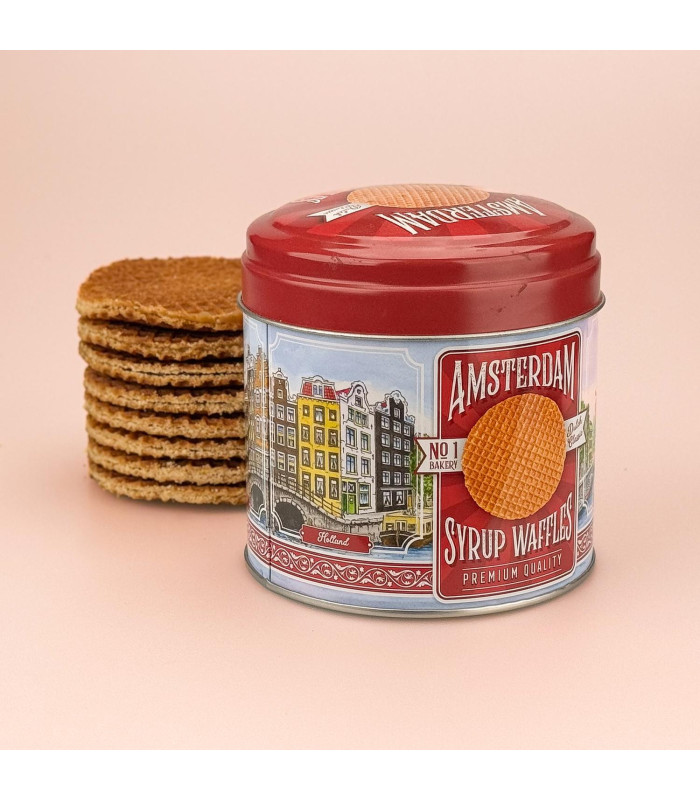 Een smakelijk stukje Amsterdam! Dit blik met 8 stroopwafels is een must-have voor liefhebbers van Nederlandse lekkernijen en een prachtig souvenir.