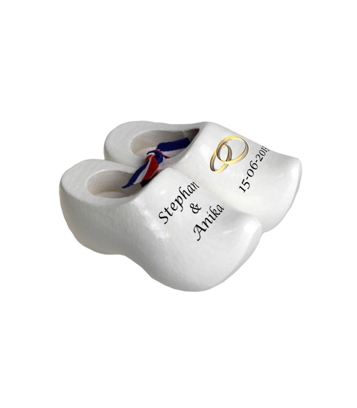 Houten souvenir klompjes zijn wit of blank gelakt en in Holland gemaakt. De twee klompjes worden bijeengehouden met een rood-wit-blauw lintje. Ze zijn 5 centimeter groot en je neemt ze dus gemakkelijk mee in je koffer. Bij grotere aantallen is de levertijd langer en in overleg.